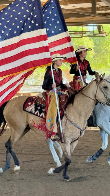 We practice Monday evenings 5:30-7PM to avoid the heat. Team tryouts are held as needed, after a rider attends three practices a decision will be made to offer a position or not. Drill routines are performed at a lope, parades at a walk. Skilled riders can attend one practice as our guest, consecutive practice invitations will be at the captain/coach’s discretion.